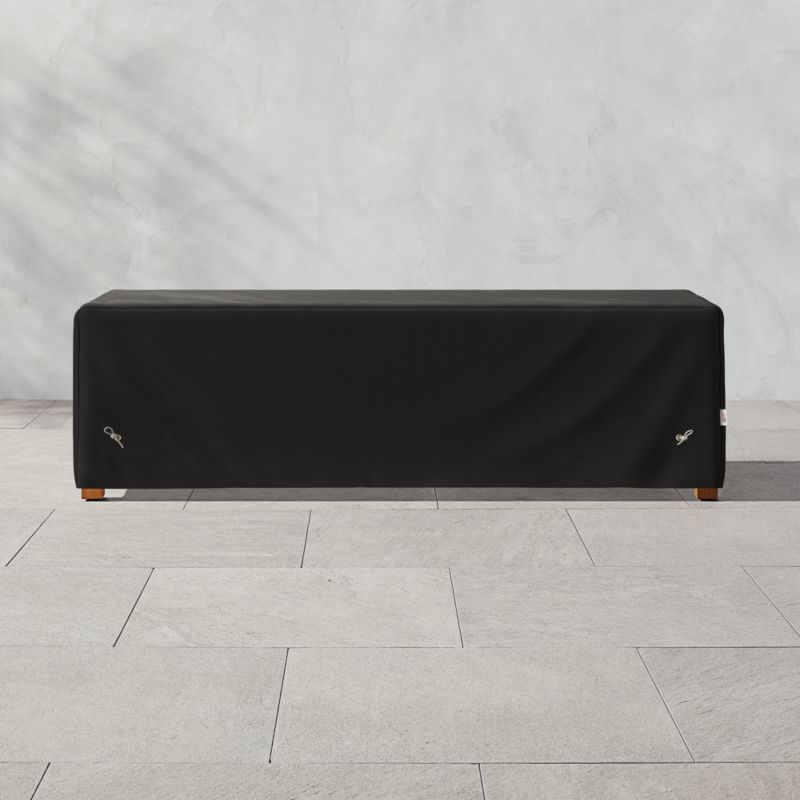 Keep your Roc outdoor dining bench looking great for seasons to come. Lightweight and durable cover is uniquely woven to resist wear and fading. One-way breathable fabric allows moisture to evaporate while water-resistant finish protects against rain, snow and sleet. Cover stays put with a clip-and-cord system. Cover comes with a pouch for neat storage. CB2 exclusive.