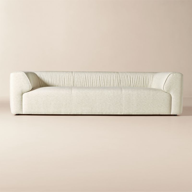 Low-slung sofa by Studio ANANSI is a modern classic. Featuring a welt trim along the perimeter, the oversized frame is wrapped in a high-performance fabric with a delicate ruched detail for relaxed lounging. The tonal white performance fabric is distinguished by a soft, textural hand while resisting stains and pilling with ease. CB2 exclusive.