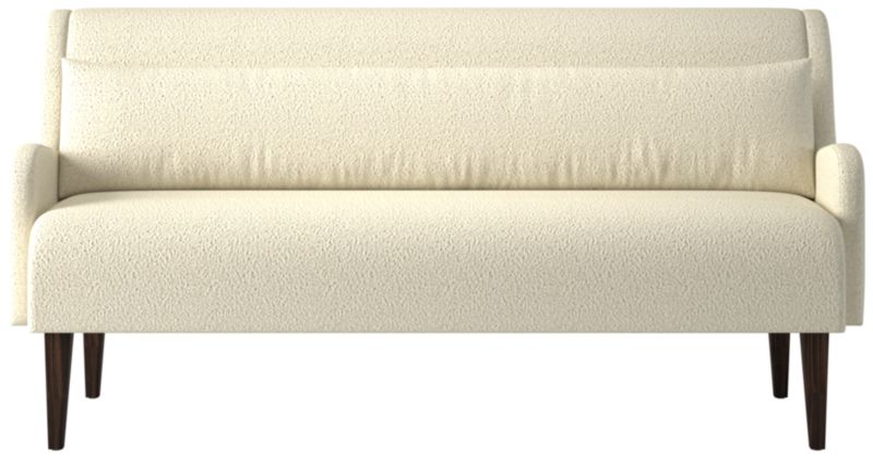 Dining bench by Sam Baron pairs sculptural form with tactile warmth. Upholstered bench features subtly rolled arms and a high, gently reclined back that invites longer meals and lingering conversation. A down-blend lumbar pillow adds relaxed support while balancing the bench's tailored profile. Conical legs, crafted from solid rubberwood certified sustainable by the Forest Stewardship Council® (FSC) and finished in a dark brown stain, ground the silhouette with quiet sophistication. Seats up to three. CB2 exclusive.