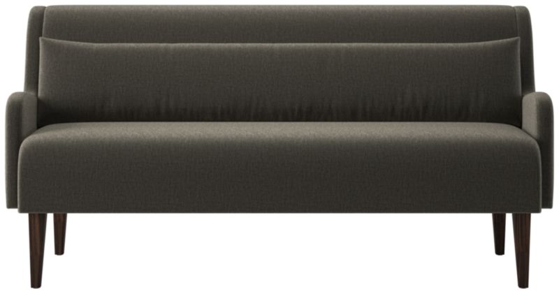 Dining bench by Sam Baron pairs sculptural form with tactile warmth. Upholstered bench features subtly rolled arms and a high, gently reclined back that invites longer meals and lingering conversation. A down-blend lumbar pillow adds relaxed support while balancing the bench's tailored profile. Conical legs, crafted from solid rubberwood certified sustainable by the Forest Stewardship Council® (FSC) and finished in a dark brown stain, ground the silhouette with quiet sophistication. Seats up to three. CB2 exclusive.