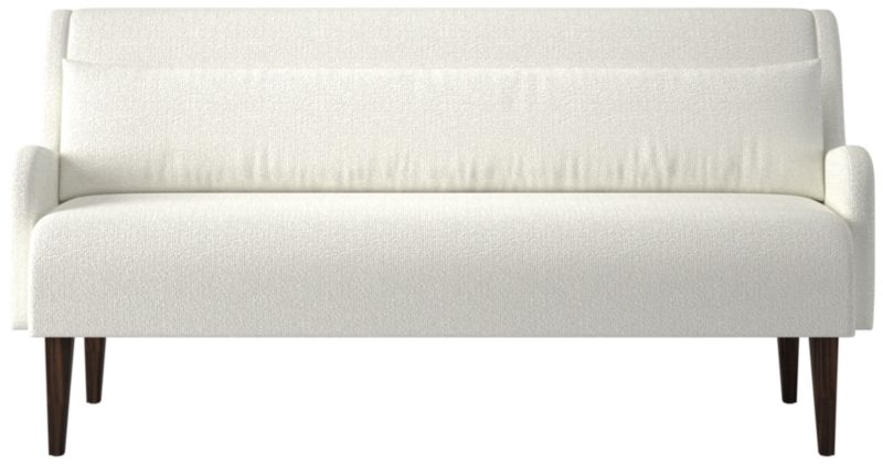 Dining bench by Sam Baron pairs sculptural form with tactile warmth. Upholstered bench features subtly rolled arms and a high, gently reclined back that invites longer meals and lingering conversation. A down-blend lumbar pillow adds relaxed support while balancing the bench's tailored profile. Conical legs, crafted from solid rubberwood certified sustainable by the Forest Stewardship Council® (FSC) and finished in a dark brown stain, ground the silhouette with quiet sophistication. Seats up to three. CB2 exclusive.