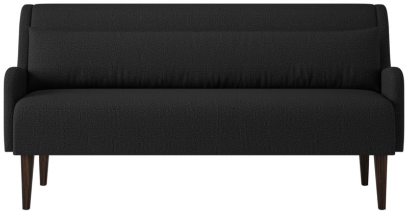Dining bench by Sam Baron pairs sculptural form with tactile warmth. Upholstered bench features subtly rolled arms and a high, gently reclined back that invites longer meals and lingering conversation. A down-blend lumbar pillow adds relaxed support while balancing the bench's tailored profile. Conical legs, crafted from solid rubberwood certified sustainable by the Forest Stewardship Council® (FSC) and finished in a dark brown stain, ground the silhouette with quiet sophistication. Seats up to three. CB2 exclusive.