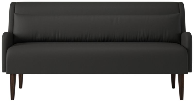 Dining bench by Sam Baron pairs sculptural form with tactile warmth. Upholstered bench features subtly rolled arms and a high, gently reclined back that invites longer meals and lingering conversation. A down-blend lumbar pillow adds relaxed support while balancing the bench's tailored profile. Conical legs, crafted from solid rubberwood certified sustainable by the Forest Stewardship Council® (FSC) and finished in a dark brown stain, ground the silhouette with quiet sophistication. Seats up to three. CB2 exclusive.