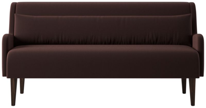 Dining bench by Sam Baron pairs sculptural form with tactile warmth. Upholstered bench features subtly rolled arms and a high, gently reclined back that invites longer meals and lingering conversation. A down-blend lumbar pillow adds relaxed support while balancing the bench's tailored profile. Conical legs, crafted from solid rubberwood certified sustainable by the Forest Stewardship Council® (FSC) and finished in a dark brown stain, ground the silhouette with quiet sophistication. Seats up to three. CB2 exclusive.