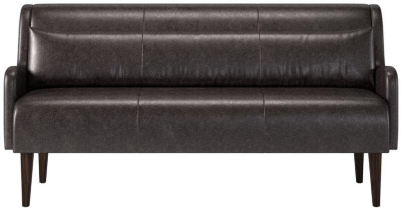 Dining bench by Sam Baron pairs sculptural form with tactile warmth. Upholstered in smooth top grain buffalo leather, it features subtly rolled arms and a high, gently reclined back that invites longer meals and lingering conversation. A down-blend lumbar pillow adds relaxed support while balancing the bench's tailored profile. Conical legs, crafted from solid rubberwood certified sustainable by the Forest Stewardship Council® (FSC) and finished in a dark brown stain, ground the silhouette with quiet sophistication. Seats up to three. CB2 exclusive.