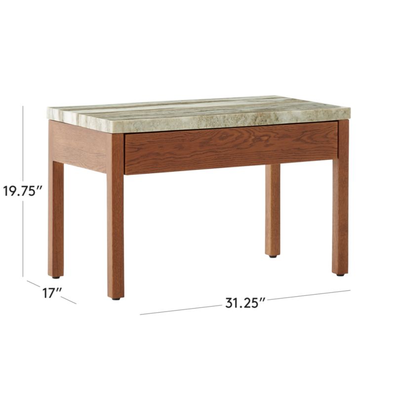 Jannis Ellenberger is a stunning addition to the bedroom. Precision-crafted from solid oak certified sustainable by the Forest Stewardship Council® (FSC), the walnut-colored frame has an undermount soft-close drawer that glides in and out. On top, a solid seamless piece of Sawar marble quarried in India is honed for a velvety finish; due to the inherent variation of this ornamental stone, each piece will have activity and veining like no other. CB2 exclusive.