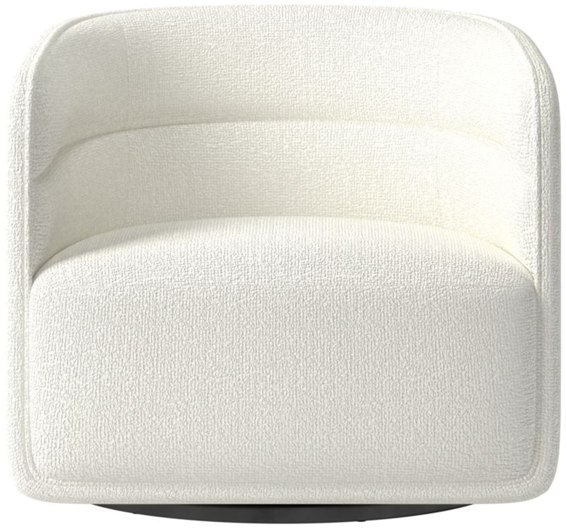 Smoothly upholstered swivel chair sports the hallmarks of a classic Mermelada Estudio design. Modern silhouette reveals design details such as horizontal tufted channels and a crisp welt around the frame for a tailored look. Soft upholstery is made to stay looking fresh while withstanding the realities of everyday living. CB2 exclusive.