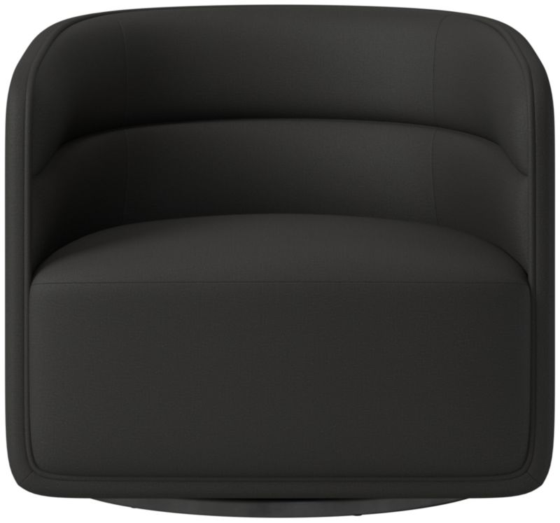 Smoothly upholstered swivel chair sports the hallmarks of a classic Mermelada Estudio design. Modern silhouette reveals design details such as horizontal tufted channels and a crisp welt around the frame for a tailored look. Soft upholstery is made to stay looking fresh while withstanding the realities of everyday living. CB2 exclusive.