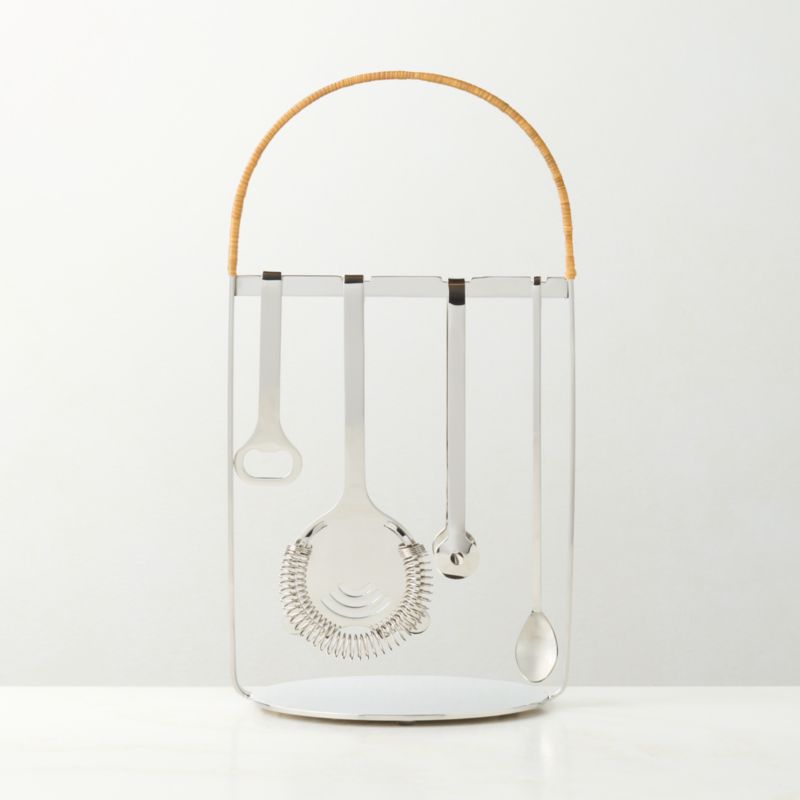 Traditional details meet modern sophistication with our mixed-material bar tool set by award-winning Japanese designer Ryuichi Kozeki. Crafted from polished stainless steel, the set includes a bottle opener, strainer, spoon, ice tongs and a stand with a contrasting rattan-wrapped handle inspired by traditional sake warmers. Pair with the other rattan-wrapped pieces in the Savoy collection. CB2 exclusive.