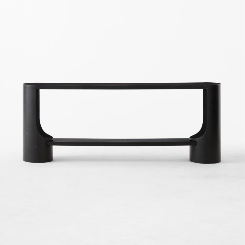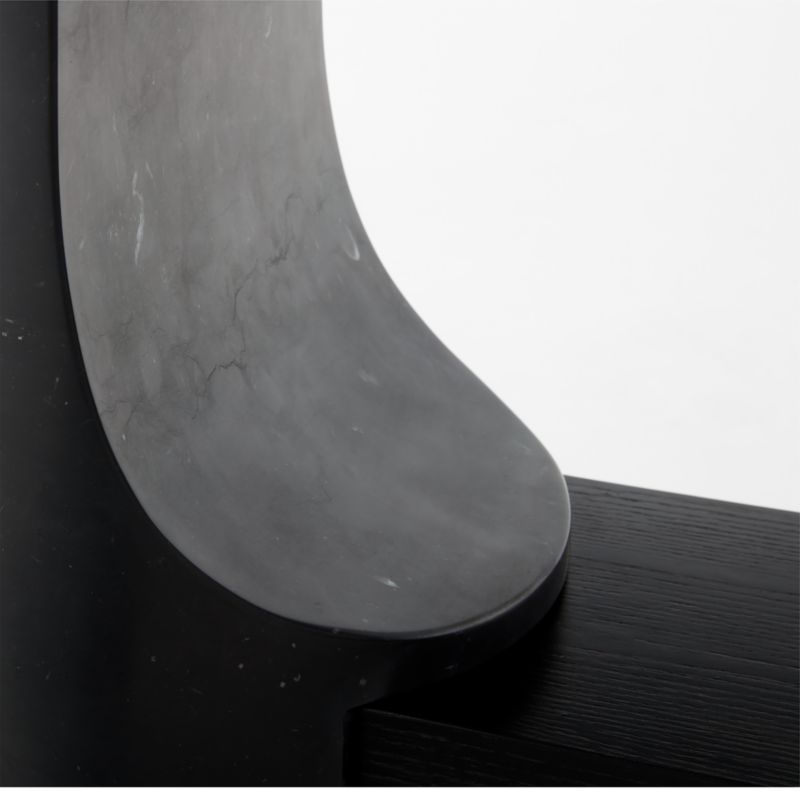 Sculptural console table by Jannis Ellenberger features solid honed Marquina black marble legs with carved curves. Nestled between the legs are two ash wood shelves with an ebonized matte finish that matches that of the marble—a subtle detail that adds to the overall cohesiveness of the piece. CB2 exclusive.