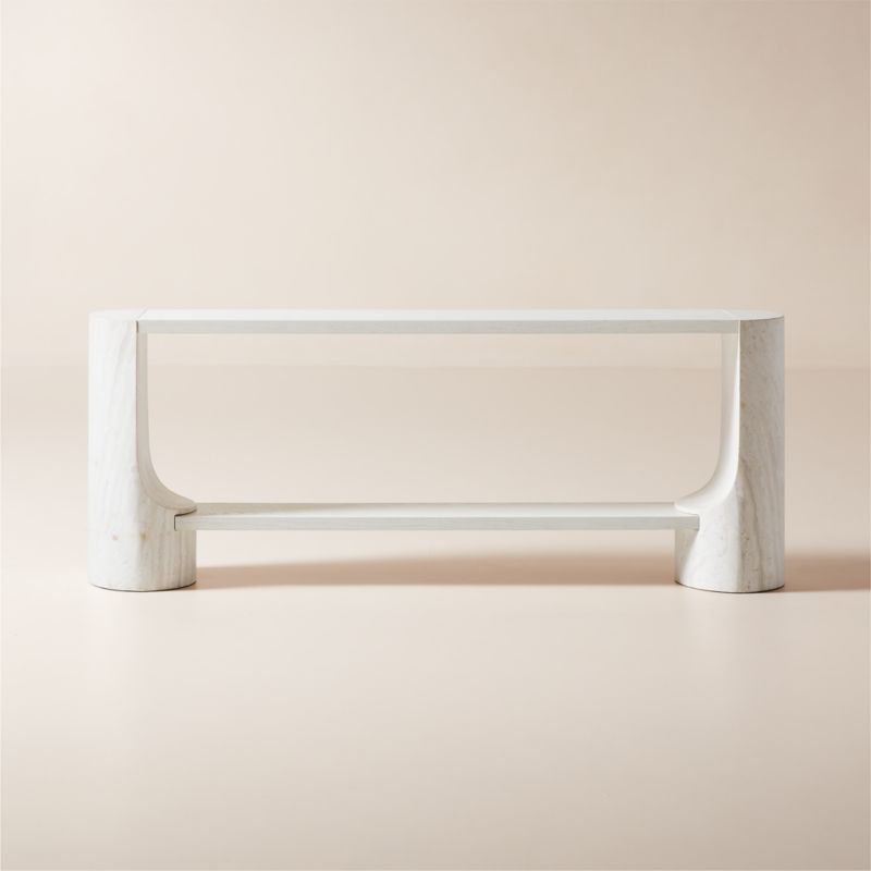 Sculptural console table by Jannis Ellenberger features thick legs with carved curves swathed in honed white travertine. Nestled between the legs are two white washed oak shelves to match the travertine—a subtle detail that adds to the overall cohesiveness of the piece. CB2 exclusive.