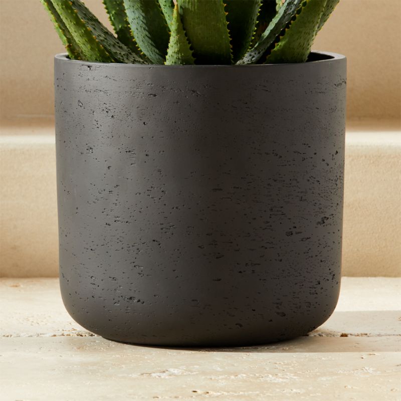 Raw material cements the foundation for lush growth. Lightweight black planter brings texture and interest to the balcony/patio/porch. Works indoors, too, and thrives in multiples. Frost-resistant. CB2 exclusive.