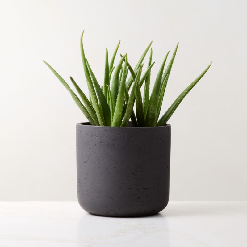 Raw material cements the foundation for lush growth. Lightweight black planter brings texture and interest to the balcony/patio/porch. Works indoors, too, and thrives in multiples. Frost-resistant. CB2 exclusive.