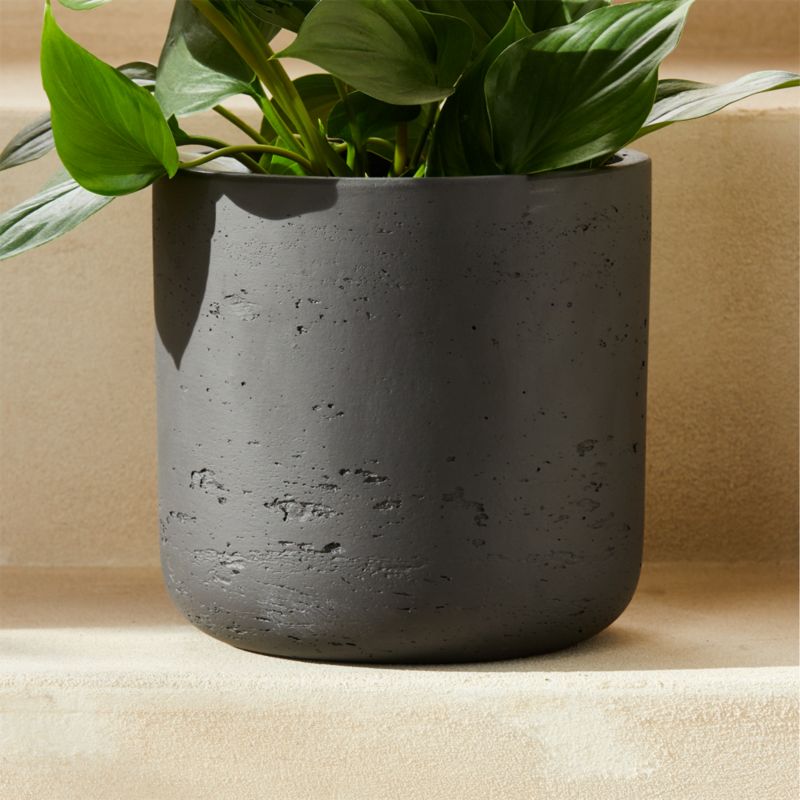 Raw material cements the foundation for lush growth. Lightweight black planter brings texture and interest to the balcony/patio/porch. Works indoors, too, and thrives in multiples. Frost-resistant. CB2 exclusive.