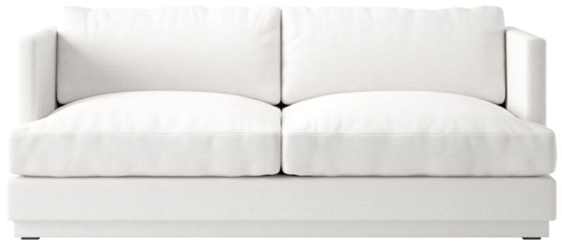 Assembled in North Carolina, crisp linen apartment sofa by Melbourne-based design studio VUUE makes a casually modern statement. The deep, low-slung silhouette leaves plenty of room for lounging with supportive feather-down cushions that sit not too firm, but not too soft. Upholstered in an elegant linen-blend performance fabric. CB2 exclusive.