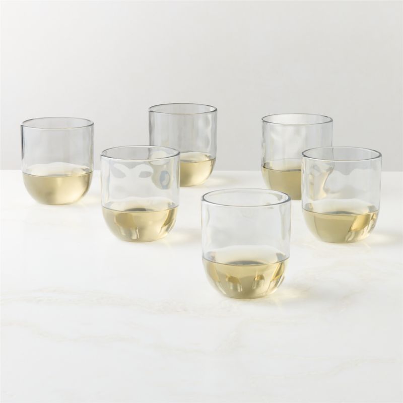 A bar staple, shatter-resistant acrylic stemless wine glasses are perfect for outdoor entertaining. Made of outdoor-friendly acrylic in a sleek smoked grey finish, the glasses feature a subtle hammered design that fits well in hand. Pair with our coordinating Sesta barware for carefree outdoor entertaining. CB2 exclusive.