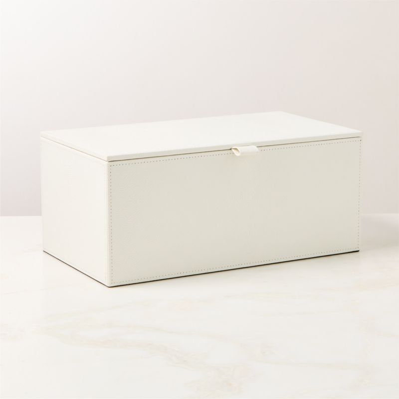 Faux shagreen box provides elegant storage for shoes and more. Highly coveted by French designers during the Art Deco era, shagreen was traditionally sourced from natural stingray hides for its rich, pebbled texture. Ivory faux shagreen is used here to recreate the look and feel of its natural counterpart. CB2 exclusive.