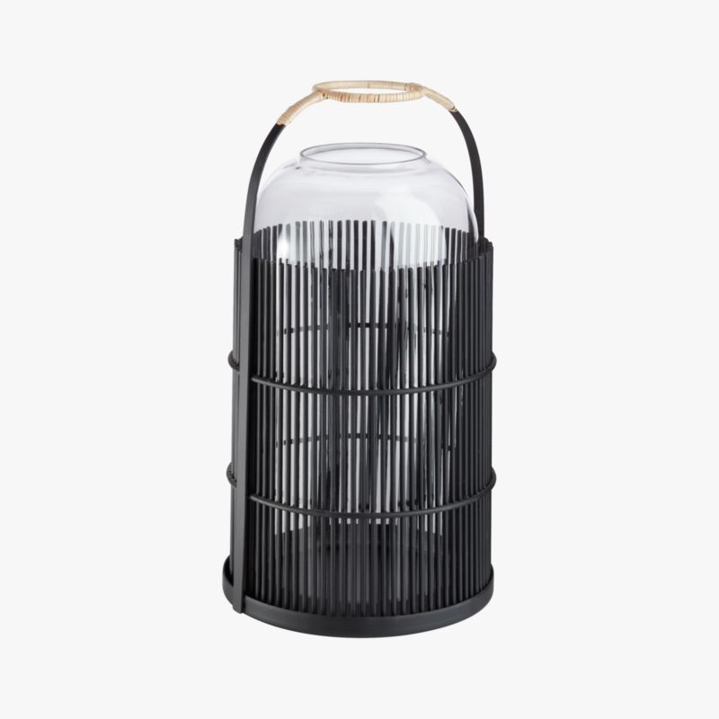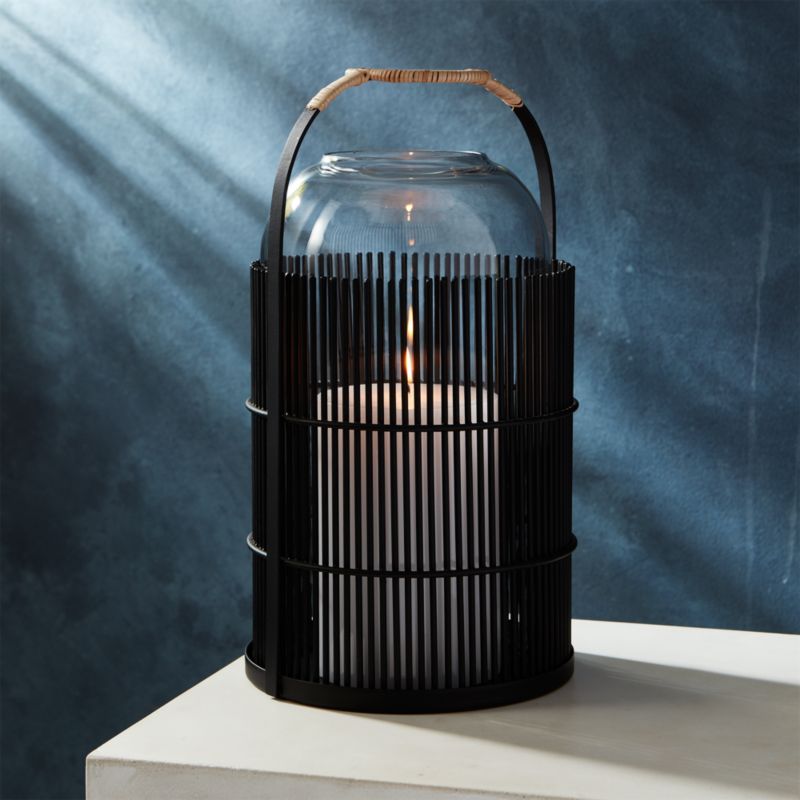 Lanterns light practically every doorway, garden, street, table top and hallway in Japan. Ours takes an unexpected turn in black iron courtesy of the modern/minimalist sensibilities of designer Ross Cassidy. Dome-shaped glass hurricane holds single pillar candle. Rattan-wrapped handle makes it mobile with minimal effort. shoji hurricane-lantern is a CB2 exclusive.