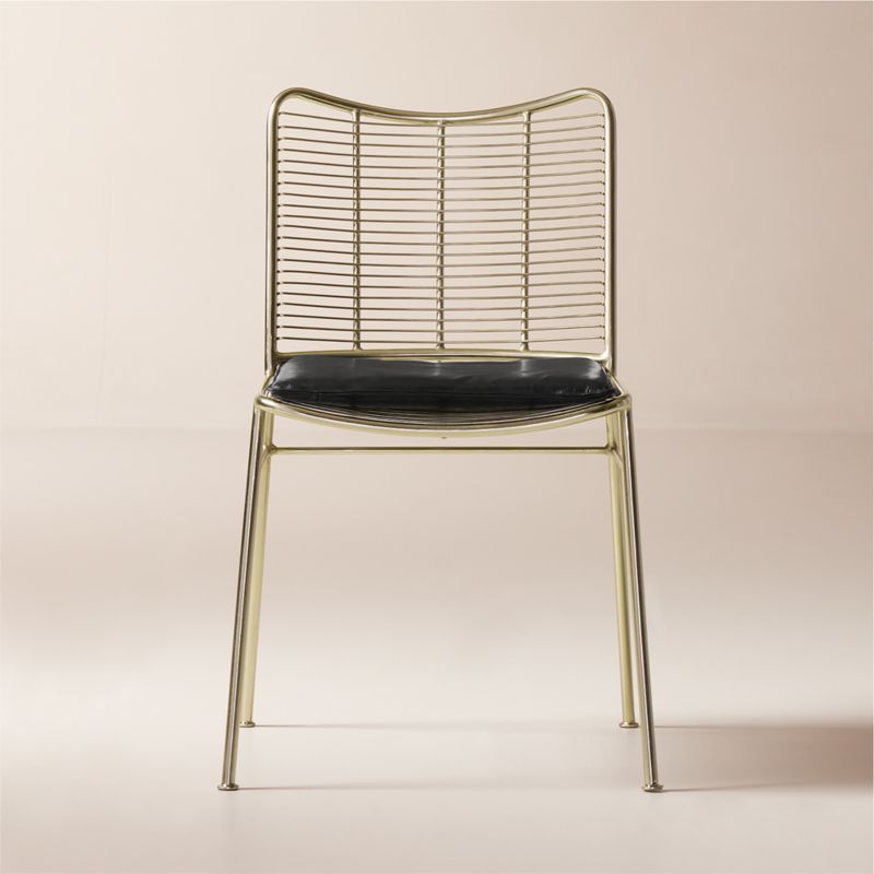 Iron dining chair borrows from industrial design yet has a refined, airy silhouette. Horizontal wire weave construction and curved backrest cut a striking profile in a warm champagne brass finish. Glossy and sleek, the black leather seat cushion will only become more beautiful as it develops a unique patina over time. CB2 exclusive.
