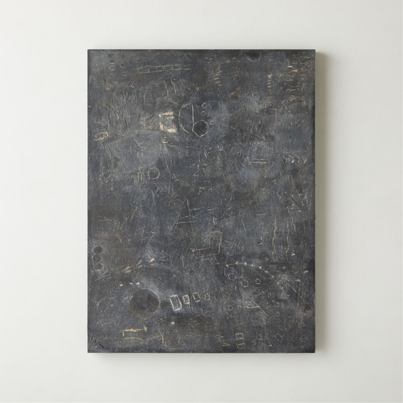 In Stephane Fontaine's "Signs," abstract etchings mark an expanse of charcoal black. "This is from an ongoing series of meditations on semiotics and explorations into the origin of signs in human society," he explains. The artist begins his contemplative work by creating a cave-like texture with a plaster mix. He then carves lines into the plaster, creating depth and adding to the narrative of fading, older symbols. Reproduced here to emulate the artist's original techniques. Hangs in two orientations.