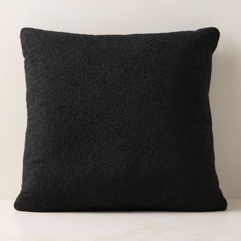Handwoven from recycled yarns, outdoor pillow is characterized by the nubby texture and soft hand of boucle in black. CB2 exclusive.