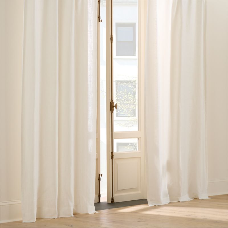 Warm white sheer curtain panel balances texture and lightness through a soft linen blend. Its understated open weave gently filters light, lending an airy quality and a layer of subtle visual interest to the room. CB2 exclusive.