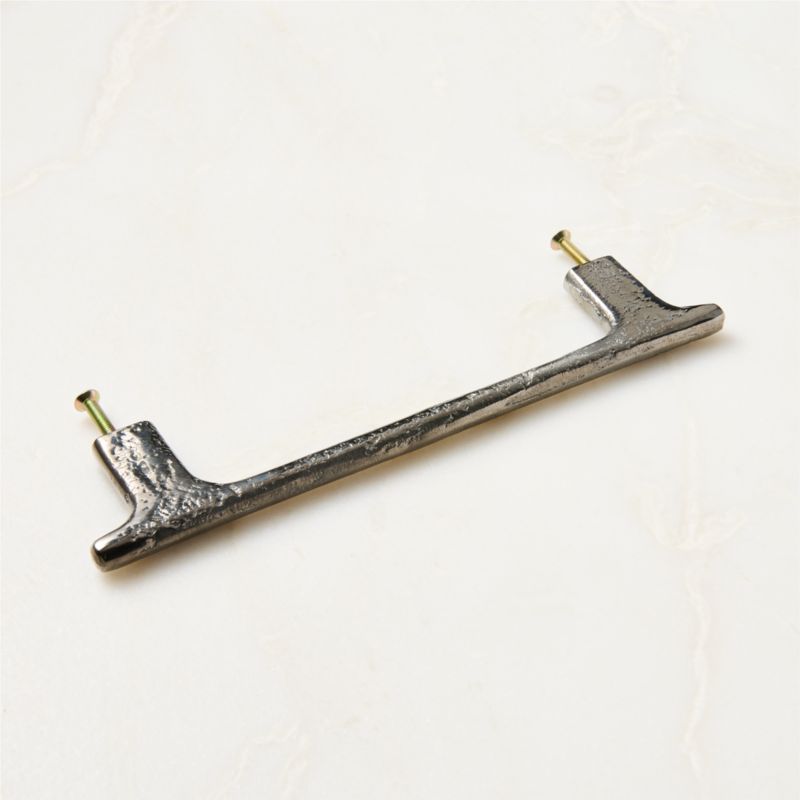 Solid brass handle by Barcelona-based Mermelada Estudio features an organic shape with natural pitted texture. Brass is unlacquered, offering a living finish that will develop the patina of a vintage find. Pair with the Somerset knob for a coordinated look. CB2 exclusive.