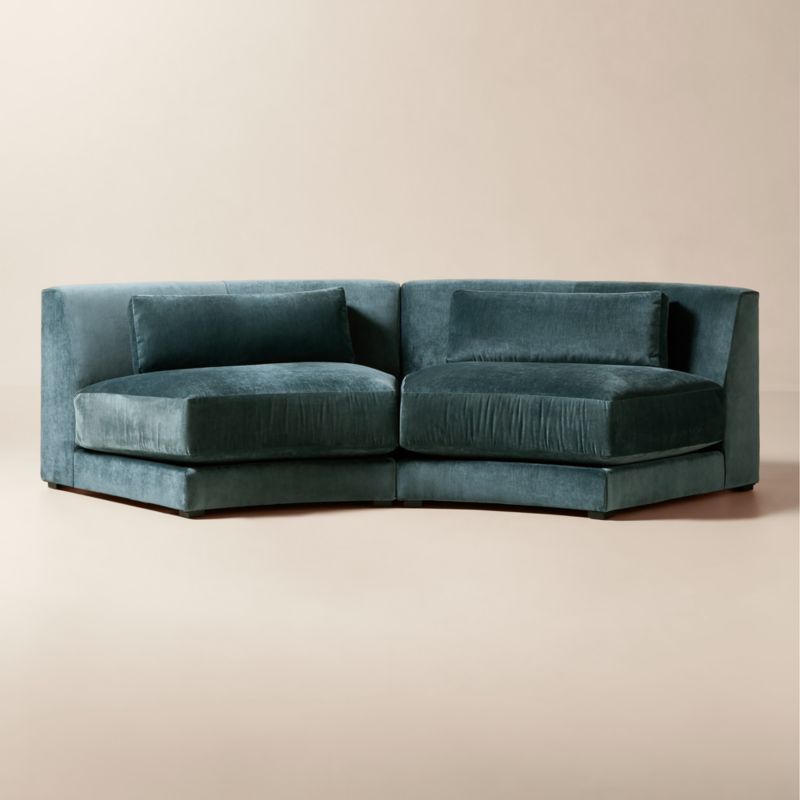 Mermelada Estudio of its design. "Its form bends gracefully to shape the room around it." Crafted in North Carolina, the frame is built from wood certified by the Forest Stewardship Council ® (FSC) and joined with traditional mortise-and-tenon construction for superior stability. Its performance textured velvet upholstery offers an elegant handfeel and easy care. With its fluid silhouette and deep, comfortable seating, the piece draws the eye while offering connection. CB2 exclusive.