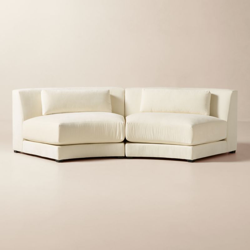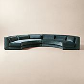 Sculptural yet inviting, curved sectional sofa embodies the balance of strength and softness. "This sofa emerges from the idea of a gesture made permanent—a simple curve that carries both strength and softness," says Mermelada Estudio of its design. "Its form bends gracefully to shape the room around it." Crafted in North Carolina, the frame is built from wood certified by the Forest Stewardship Council ® (FSC) and joined with traditional mortise-and-tenon construction for superior stability. Its performance textured velvet upholstery offers an elegant handfeel and easy care. With its fluid silhouette and deep, comfortable seating, the piece draws the eye while offering connection. CB2 exclusive.