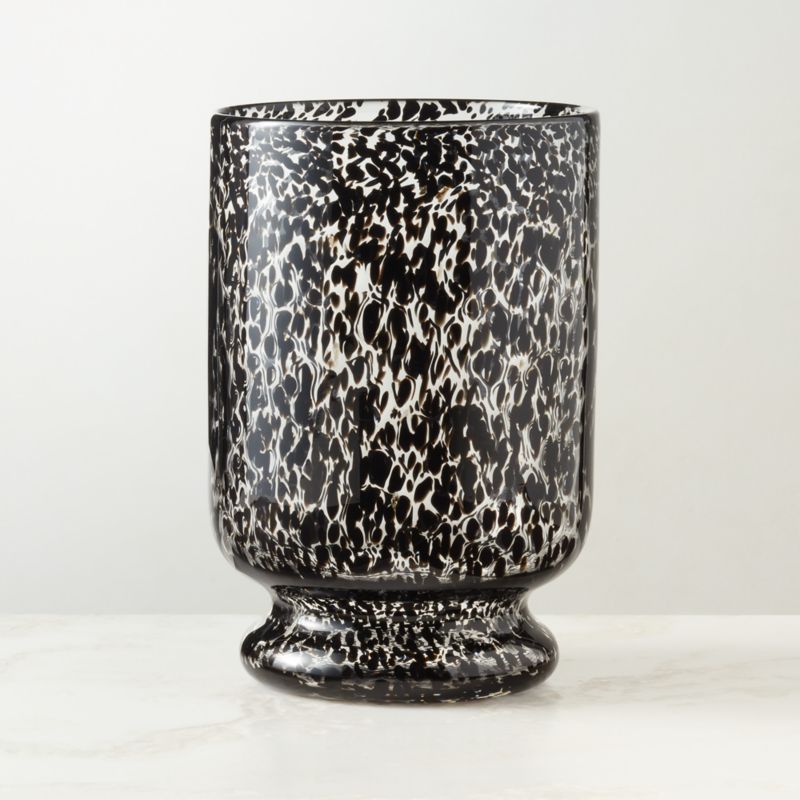 Cylindrical hurricane candle holder is accented with black specks in handblown glass, a detail that creates a unique glow when lit. As the glassblower stretches out the glass, the clear space between specks becomes larger, producing variations in the finish that make each piece one of a kind. Can be used indoors or out. Pair with large hurricane candle holder for a full collection. CB2 exclusive.
