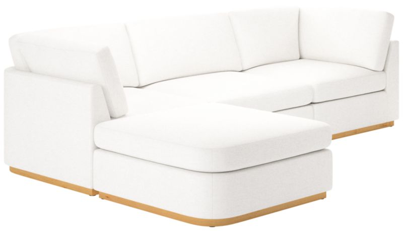 Sectional sofa's clean, minimalist-profile white oak plinth base and cloud-like comfort embodies Ross Cassidy's signature style of understated luxury. Plush cushions are generously filled with a fluffy mix of feathers, down and fibers to create a soft place to sink into. Performance boucle in ivory adds tonal texture. Built by hand in Mississippi using kiln-dried hardwood, sectional will bring style to the living space for years to come. CB2 exclusive.