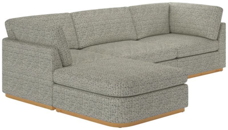 Sectional sofa's clean, minimalist-profile white oak plinth base and cloud-like comfort embodies Ross Cassidy's signature style of understated luxury. Plush cushions are generously filled with a fluffy mix of feathers, down and fibers to create a soft place to sink into. Performance boucle in ivory adds tonal texture. Built by hand in Mississippi using kiln-dried hardwood, sectional will bring style to the living space for years to come. CB2 exclusive.