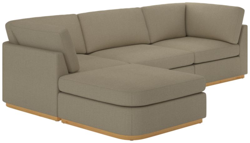 Sectional sofa's clean, minimalist-profile white oak plinth base and cloud-like comfort embodies Ross Cassidy's signature style of understated luxury. Plush cushions are generously filled with a fluffy mix of feathers, down and fibers to create a soft place to sink into. Performance boucle in ivory adds tonal texture. Built by hand in Mississippi using kiln-dried hardwood, sectional will bring style to the living space for years to come. CB2 exclusive.