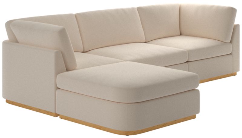 Sectional sofa's clean, minimalist-profile white oak plinth base and cloud-like comfort embodies Ross Cassidy's signature style of understated luxury. Plush cushions are generously filled with a fluffy mix of feathers, down and fibers to create a soft place to sink into. Performance boucle in ivory adds tonal texture. Built by hand in Mississippi using kiln-dried hardwood, sectional will bring style to the living space for years to come. CB2 exclusive.