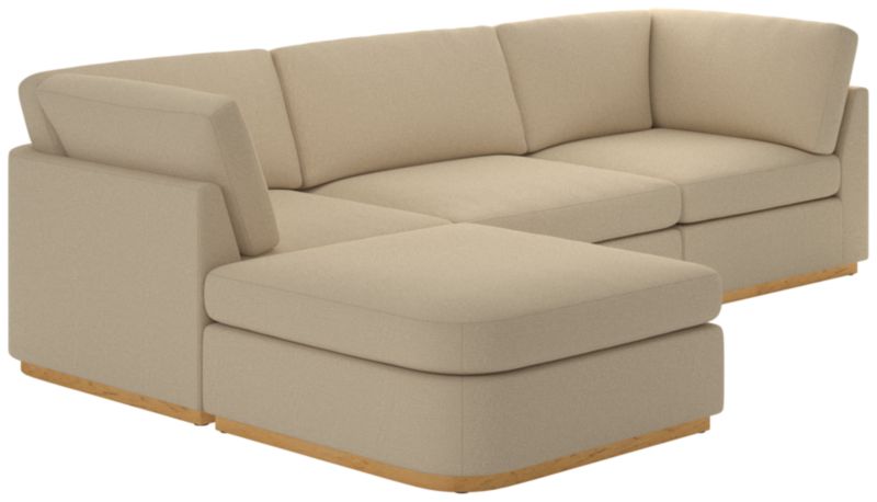 Sectional sofa's clean, minimalist-profile white oak plinth base and cloud-like comfort embodies Ross Cassidy's signature style of understated luxury. Plush cushions are generously filled with a fluffy mix of feathers, down and fibers to create a soft place to sink into. Performance boucle in ivory adds tonal texture. Built by hand in Mississippi using kiln-dried hardwood, sectional will bring style to the living space for years to come. CB2 exclusive.