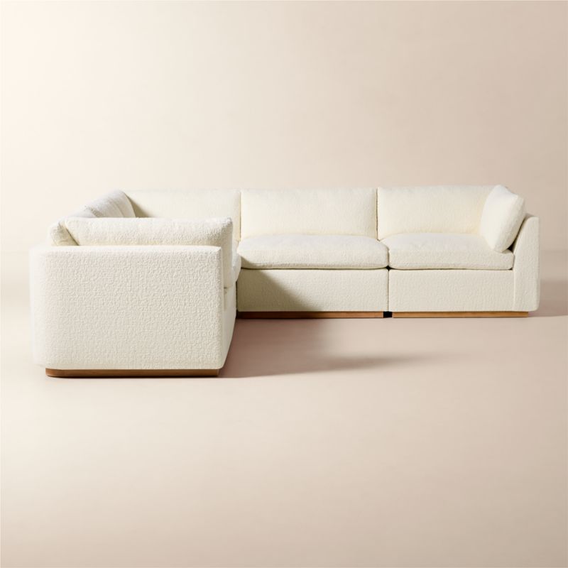 Sectional sofa's clean, minimalist-profilewhite oak plinth base and cloud-like comfort embodies Ross Cassidy's signature style of understated luxury. Plush cushions are generously filled with a fluffy mix of feathers, down and fibers to create a soft place to sink into. Performance boucle performance upholstery in ivory adds tonal texture. Built by hand in Mississippi using kiln-dried hardwood, sectional will bring style to the living space for years to come. CB2 exclusive.