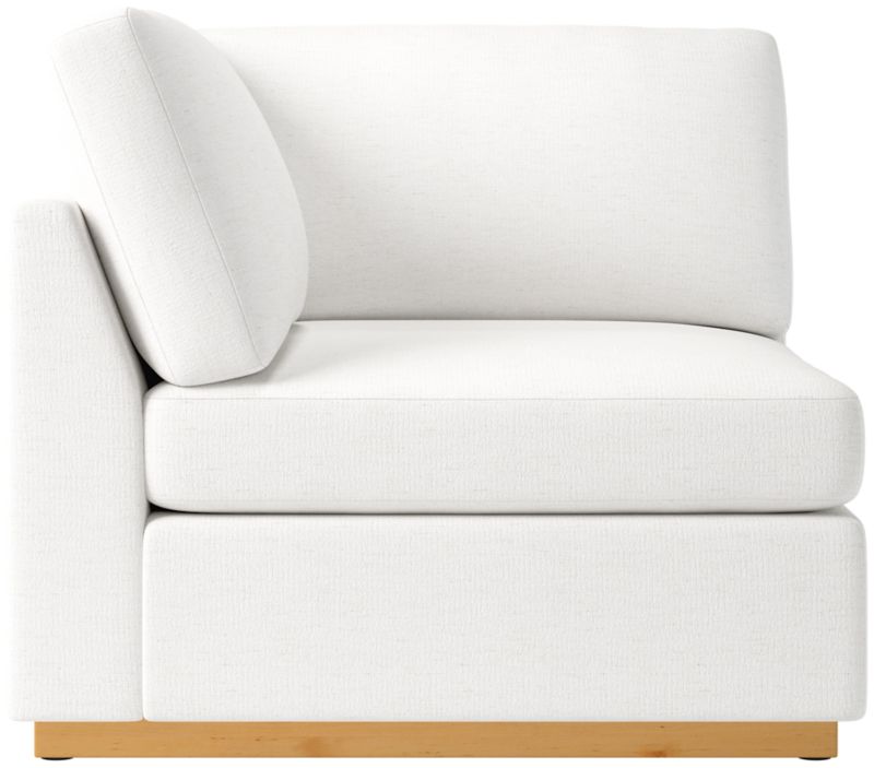 Corner chair's clean, minimalist-profile white oak plinth base and cloud-like comfort embodies Ross Cassidy's signature style of understated luxury. Plush cushions are generously filled with a fluffy mix of feathers, down and fibers to create a soft place to sink into. Performance boucle in ivory adds tonal texture. Built by hand in Mississippi using kiln-dried hardwood, corner chair can create a sectional with other Stormo pieces. CB2 exclusive.