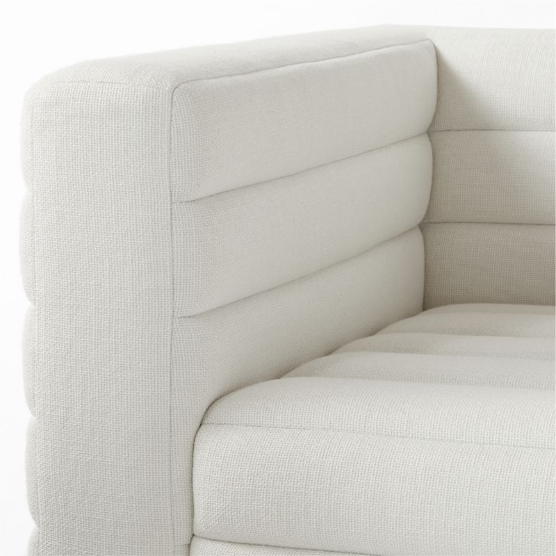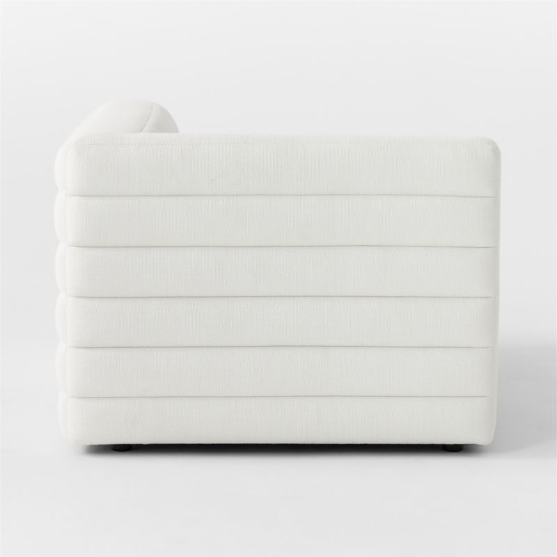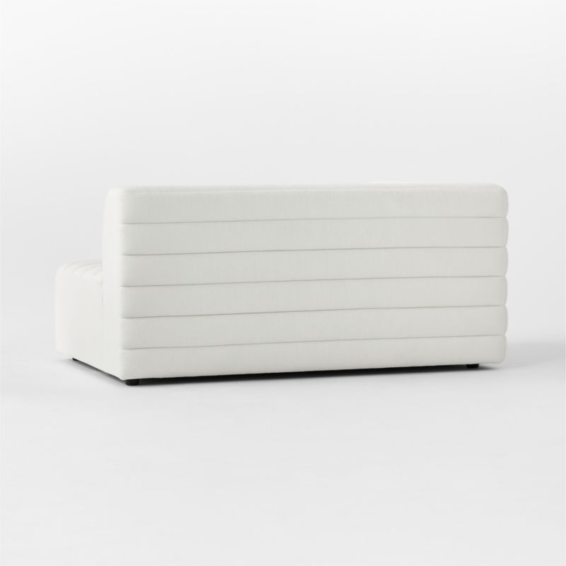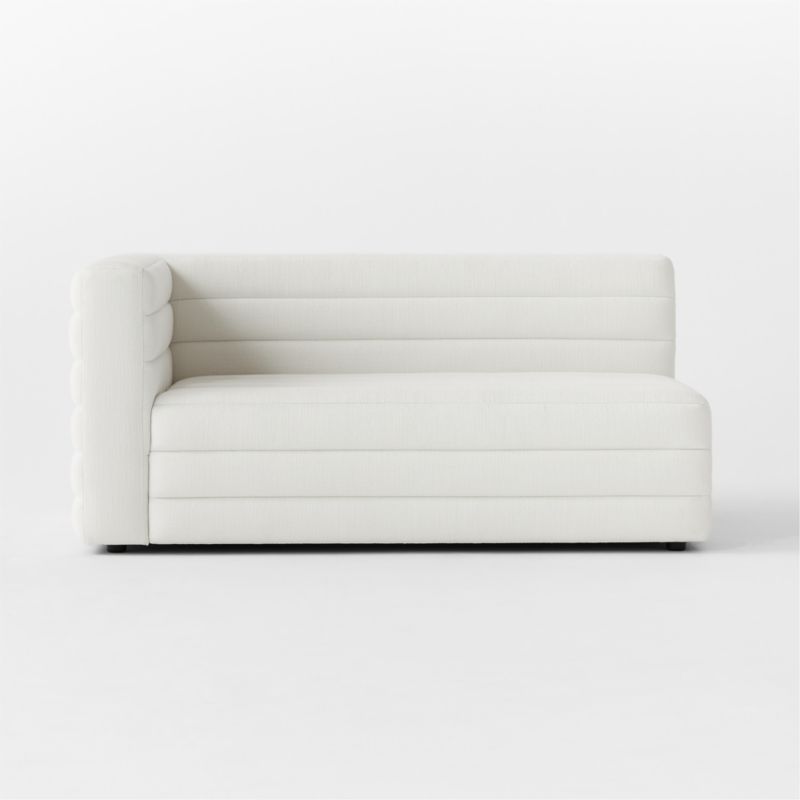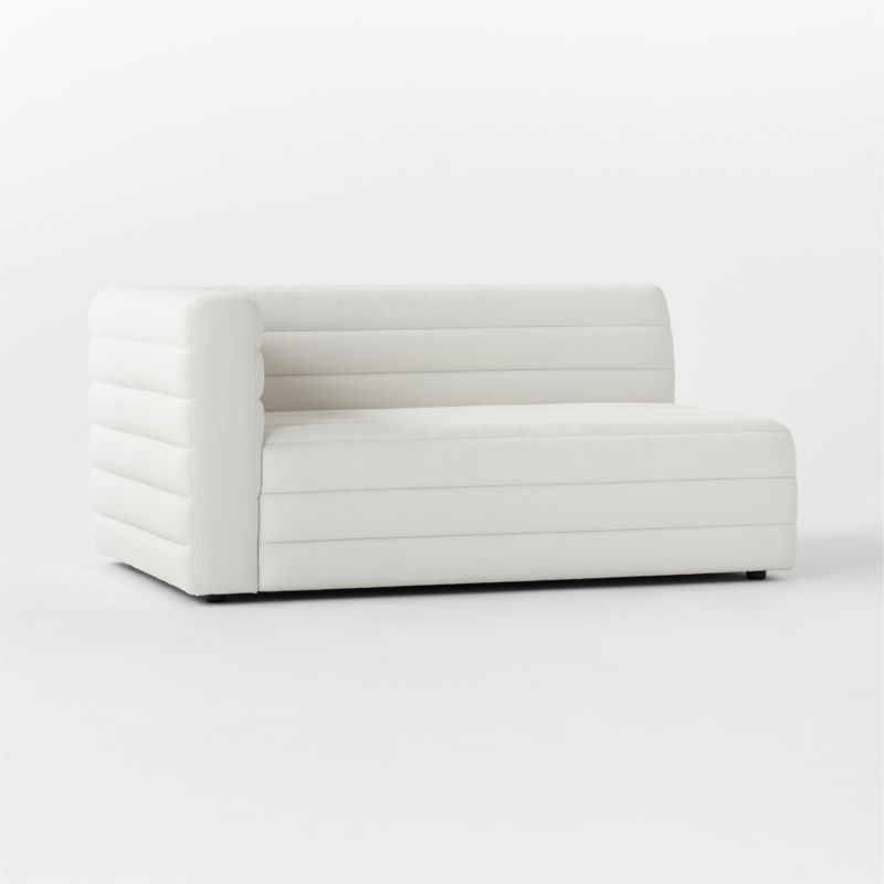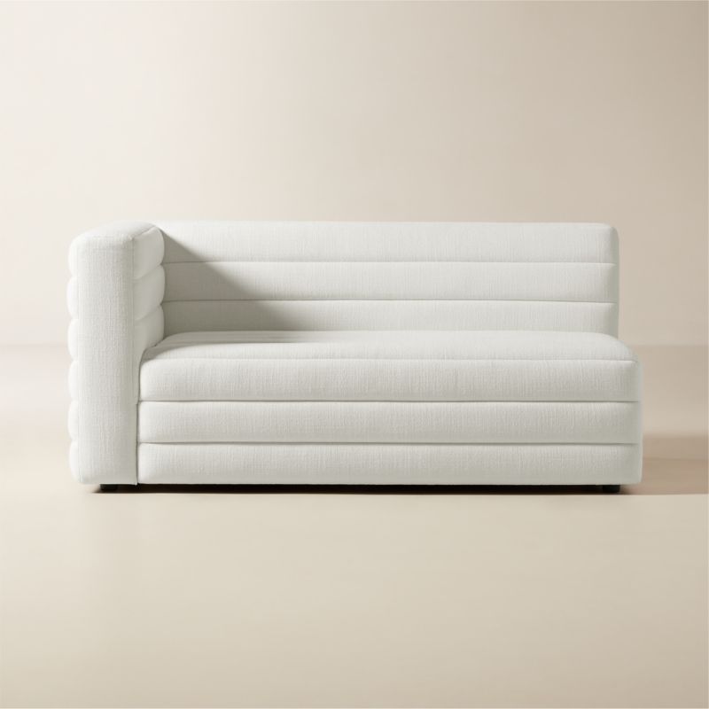 Mermelada Estudio, vintage '70s-inspired left-arm sofa is upholstered in a textured performance fabric with plush channel tufting on all sides. Pair with other Strato sectional pieces for a configuration that's right for your space. CB2 exclusive.
