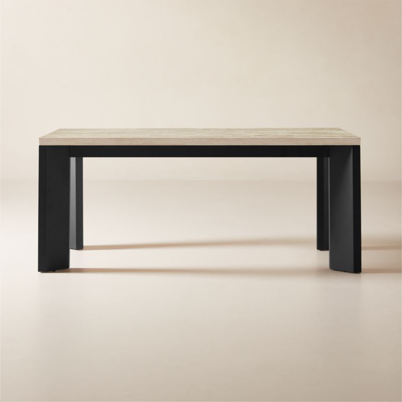 Designed by Melbourne-based VUUE, travertine dining table features a sophisticated mix of materials to elevate the classic rectangular silhouette. Warm, earthy tones of Turkish yellow travertine are juxtaposed with the smooth black steel base. Tonal variations and visible pitting on the travertine's surface add to the table's unique character, making each piece naturally one of a kind. CB2 exclusive.