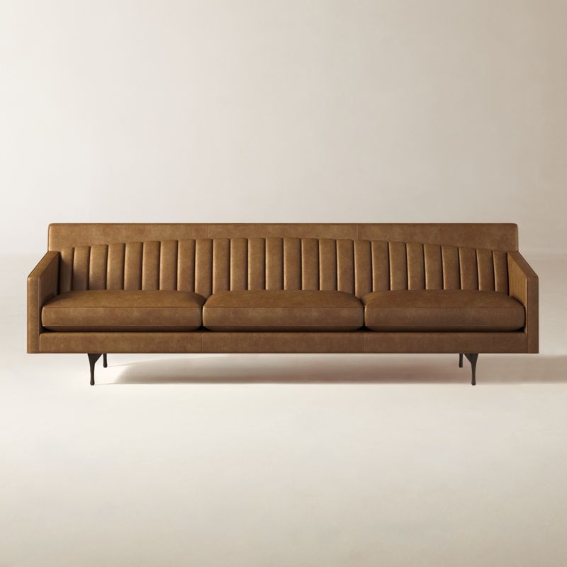 Paul McCobb in 1962 is characterized by clean lines, attention to detail and a sense of visual lightness that became a trademark of his work. Inspired by Shaker design, the sofa debuted with a channel-tufted back and slim walnut legs that made the piece appear weightless. Falling out of production after McCobb's death in 1969, the original design became highly sought after. From its sculptural curves to the angled arms, our reissue captures every coveted detail, updated in lush leather upholstery to give it a more modern look. CB2 exclusive.