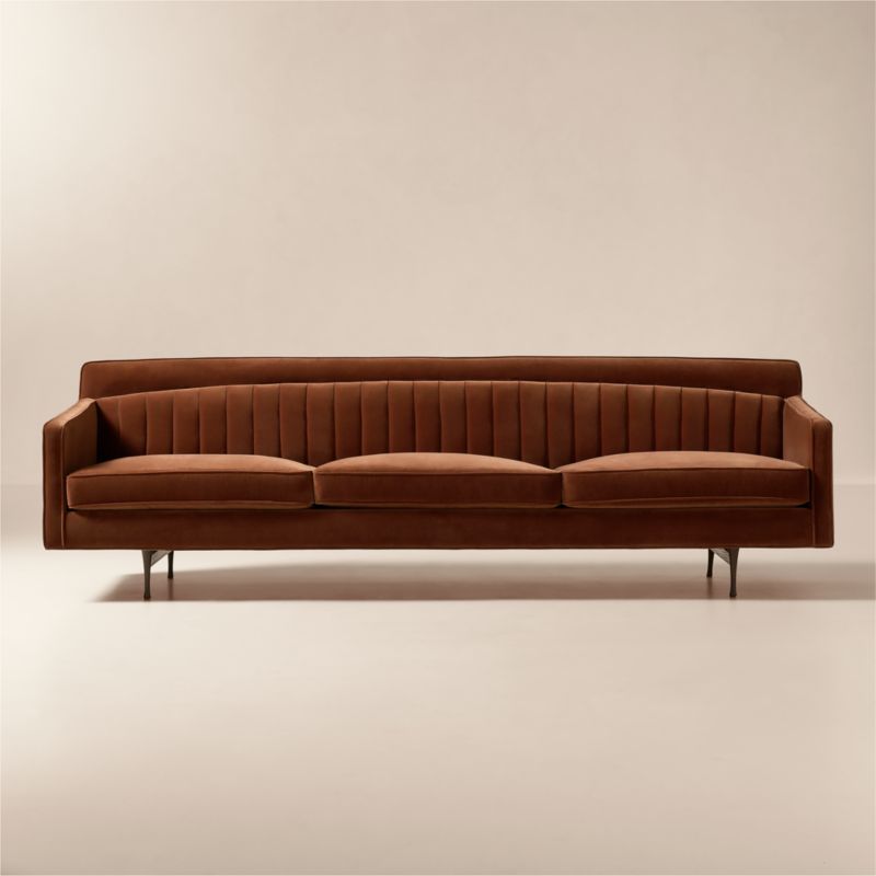 Paul McCobb in 1962 is characterized by clean lines, attention to detail and a sense of visual lightness that became a trademark of his work. Inspired by Shaker design, the sofa debuted with a channel-tufted back and slim walnut legs that made the piece appear weightless. Falling out of production after McCobb's death in 1969, the original design became highly sought after. From its sculptural curves to the angled arms, our reissue captures every coveted detail, updated in lush auburn velvet to give it a more modern look. CB2 exclusive.