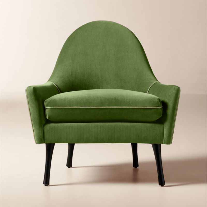 Paul McCobb in 1962 for the Widdicomb Furniture Company, this lounge chair revisits his Symmetric collection—defined by its graceful curves, slender profile and timeless proportion. Upholstered in striated 100% cotton velvet with a dark green leather welt, the design merges midcentury refinement with modern American craftsmanship. Resting on black tapered legs, each chair is hand-assembled in North Carolina, honoring McCobb's legacy of thoughtful, sculptural simplicity. CB2 exclusive.