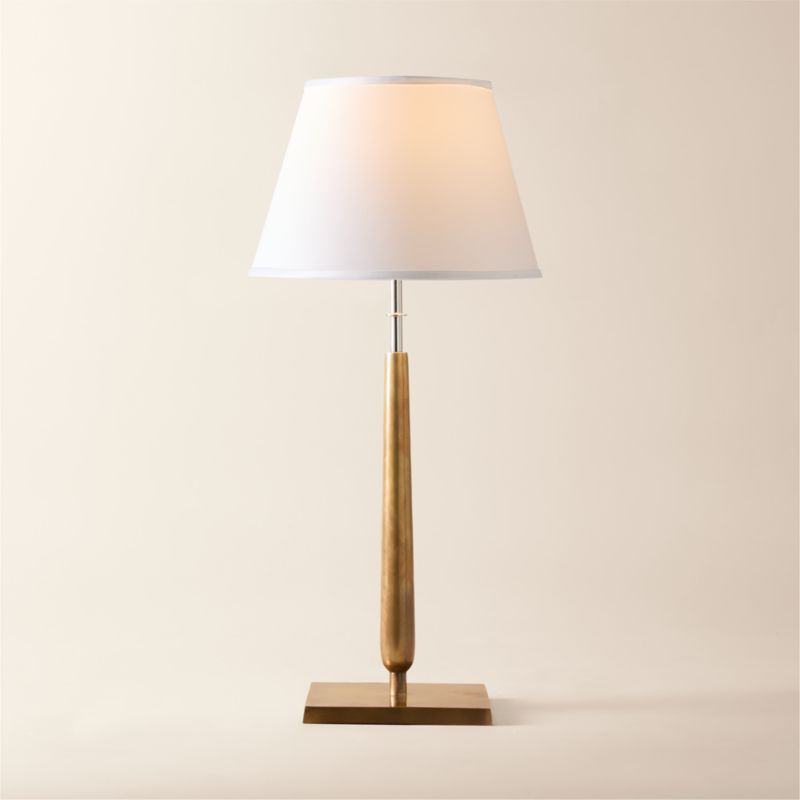 Table lamp by Kara Mann has a warm, rich finish befitting its refined profile. Beginning with raw cast brass, the finish is created through hand-touched processes of baths and polishing to create a warm bronze that will darken over time. Each lamp becomes unique as it is crafted, creating a bespoke, found feel. A subtle sateen shade with tailored taping adds a sheen to complement the warm metal base, creating a sophisticated mix of the classic and the feminine. CB2 exclusive.