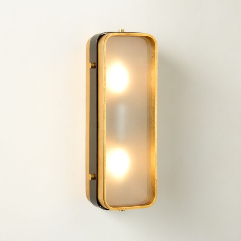 Los Angeles-based AD100 designer Ross Cassidy's Tavish sconce is a sophisticated take on Streamline Moderne architecture. Inspired by 1930s French ocean liners, details like the exposed brass bolts lend an industrial aesthetic, while sleek lines and softly rounded corners keep the look timeless. A frosted glass shade gently diffuses the light, casting a soft glow. CB2 exclusive.