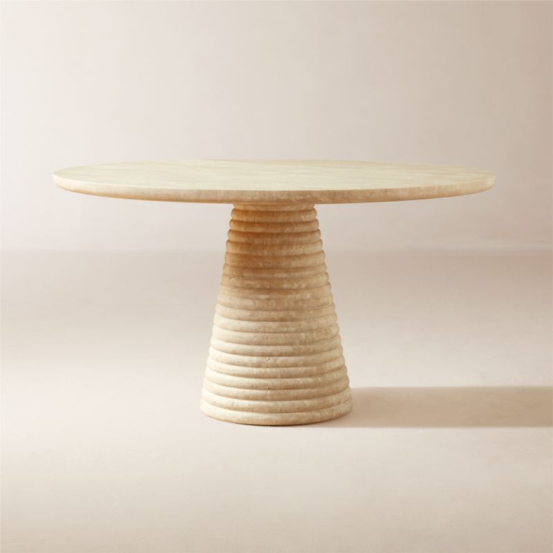 Defined by sculptural curves, round dining table from Barcelona-based Mermelada Estudio captures the warm striations and natural pitting of Turkish travertine. Supported by a carved pedestal base that gradually tapers to the floor, the travertine top is finished with a reverse half-bullnose edge. CB2 exclusive.