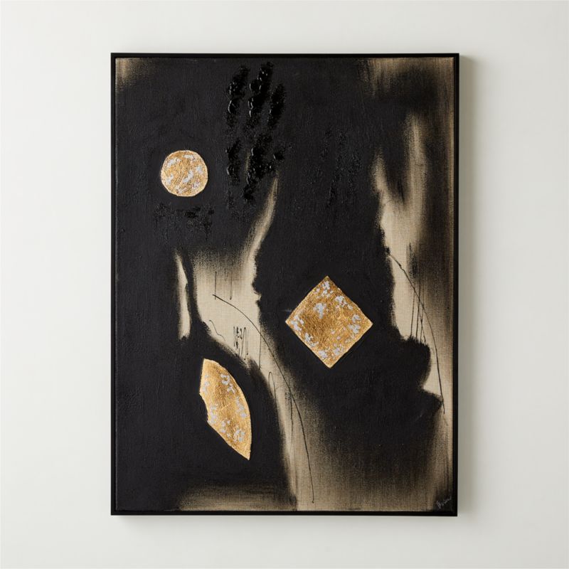 Inspired by car lights at night, Edward View's "Teodore" is alive with movement and expression. The artist pulls matte black paint across the canvas with a putty knife in a "reflection on distant city reflections from a dark field," he explains. The heavily textured black ground and blurred brushstrokes clash with spots of gold and silver leaf, offering contrast between light and dark like a car moving in the night. Reproduced here to emulate the artist's original techniques. Presented in a matte black frame that can be hung vertically or horizontally.