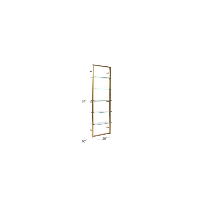 Brass bookcase designed by Mark Daniel of Slate Design draws inspo from the flashier vintage design of the '50s and anchors it into a sleek, minimalist piece of wall art. Five shelves of tempered glass are fixed to a brushed metal frame and create major drama when repeated down the wall. Stud mounting recommended; hardware included for drywall installation. Learn about
