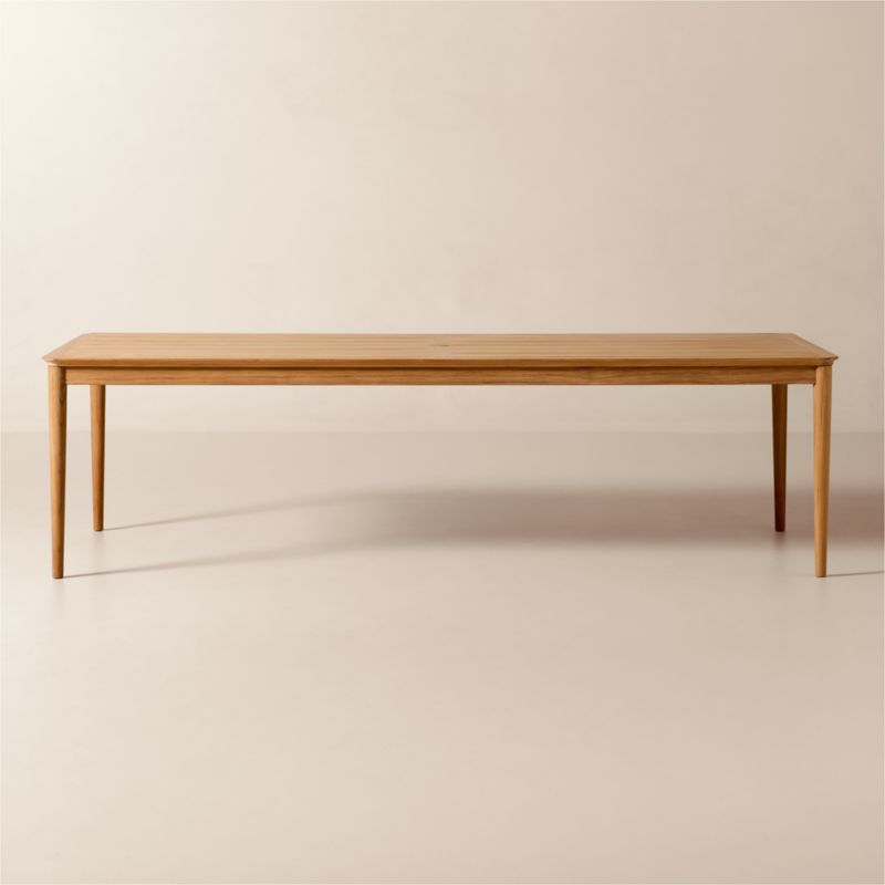 Crafted of FSC ®-certified Grade A teak, rectangular dining table by Evan Jerry of Studio ANANSI reimagines Danish modern design with its distinctive blend of clean lines and softly rounded edges. A slatted top sits on slim, tapered legs, lending a sense of weightlessness rarely seen in outdoor furnishings. Pair with the Tide dining chairs. CB2 exclusive.