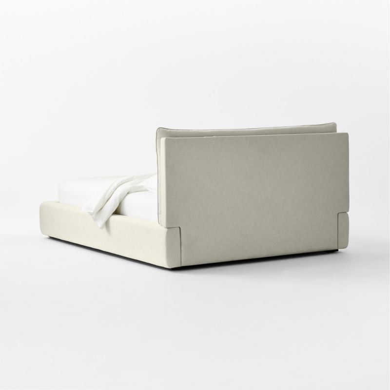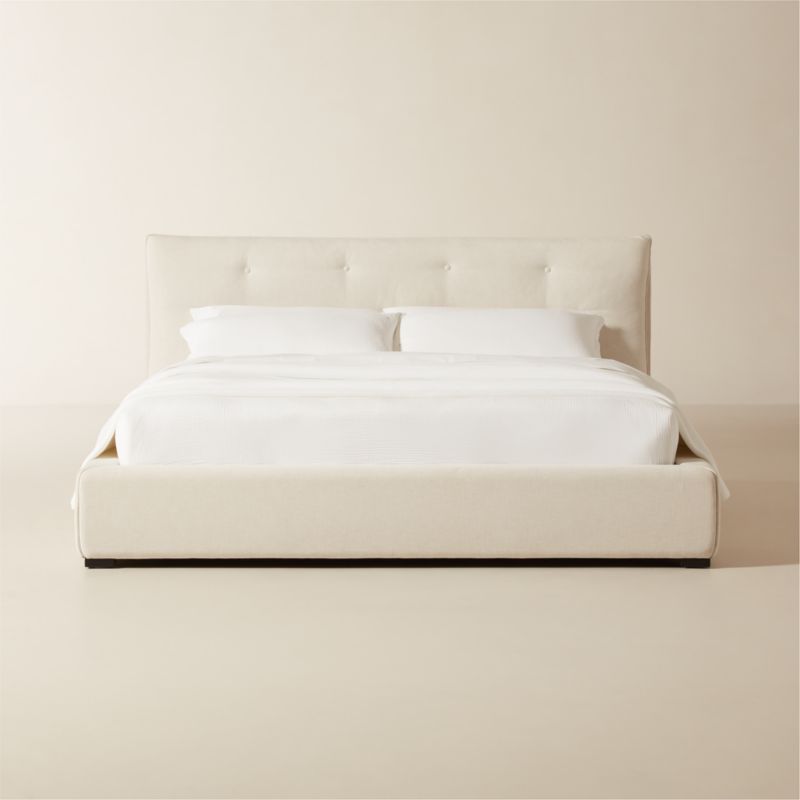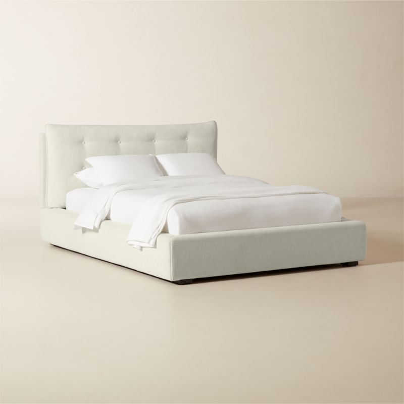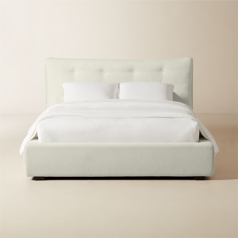 Jannis Ellenberger features a low upholstered frame with a relaxed, pillow-like headboard. Upholstered in a textural linen-cotton performance fabric, the plush headboard is generously cushioned with down and feathers and punctuated with button tufting. CB2 exclusive.