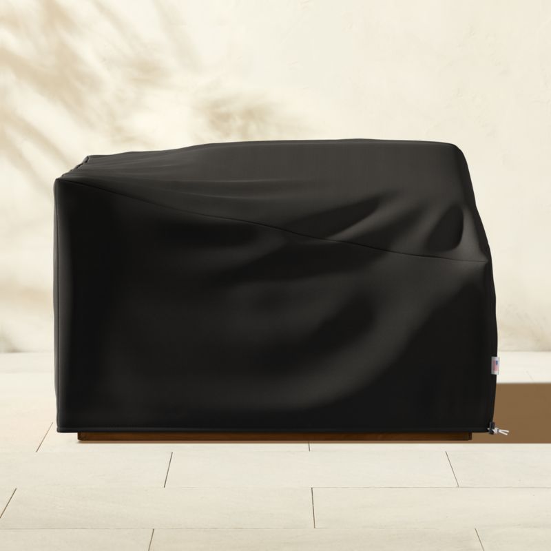 Keep your Topia outdoor corner chair looking great for seasons to come. Lightweight and durable cover is uniquely woven to resist wear and fading. One-way breathable fabric allows moisture to evaporate while water-resistant finish protects against rain, snow and sleet. Cover stays put with a drawstring system. Cover comes with a pouch for neat storage. CB2 exclusive.